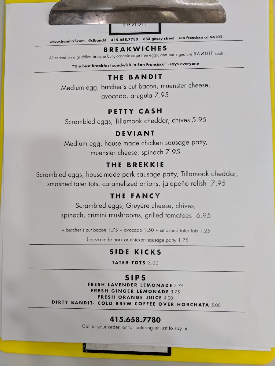 What’s breakfast without a side of drinks? Bandit serves refreshing house-made beverages, including their popular Dirty Bandit—a cold brew coffee topped with vegan horchata that is both unique and utterly satisfying at just $5.75. And don’t miss out on the freshly squeezed orange juice, available daily for $5.95, bringing a zesty brightness to your meal.
